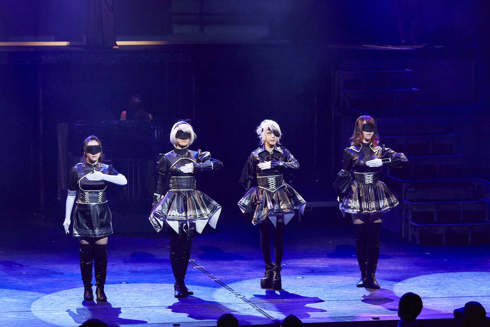 幕が上がって真っ先に目が行ったのは、主要キャスト4人が身にまとっているヨルハ部隊の衣装でした。全身黒を基調として、目隠しのゴーグルを装備し、体にフィットするように革でデザインされたそのコスチュームは、ヨルハ部隊を象徴するデザイン。ですが、戦闘で動きやすいように(設定的にはアンドロイドの義体の排熱を効率よく行うために)全員が……ものすごくミニスカートなのです!!